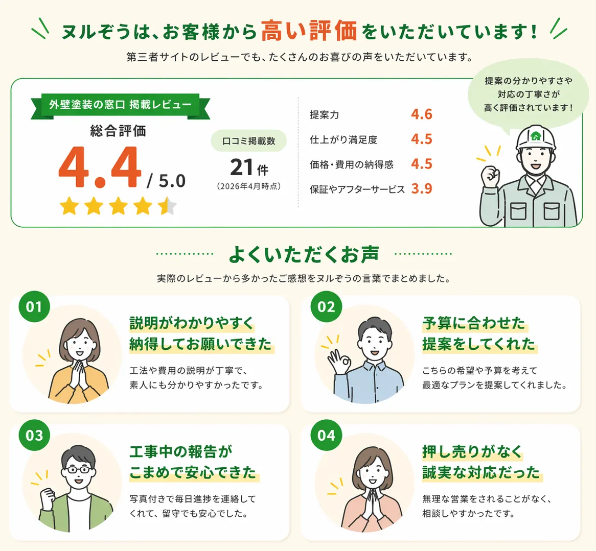 また、お客様に不必要な施工を提示することもありません。必要ないものは必要ないとちゃんとご提示致しますのでご安心ください。