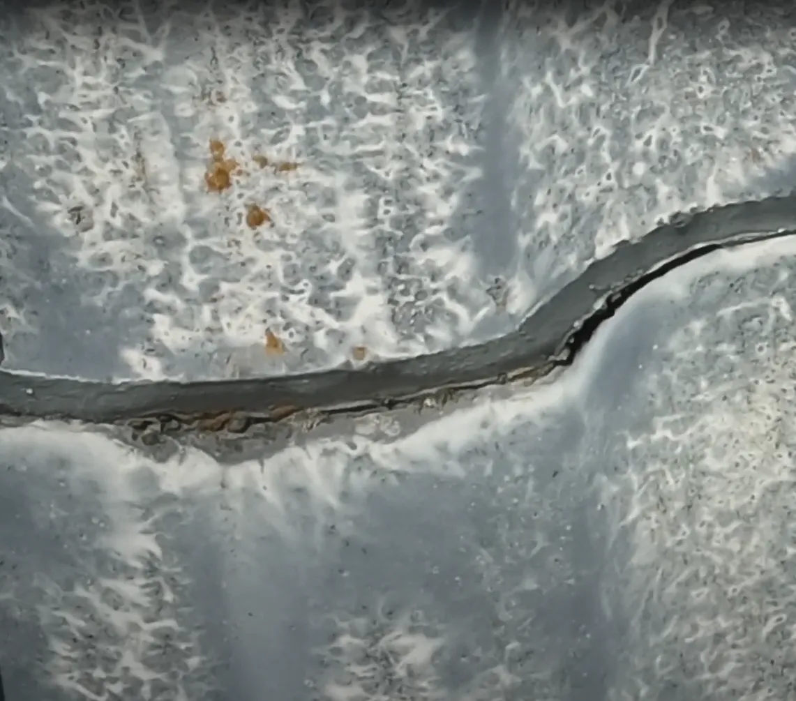 ドローンが捉えた映像には、塗装時に使用された塗料が、瓦と瓦の隙間、特に雨水の排水経路となる瓦の重なり部分にまでびっしりと詰まっている様子が鮮明に映し出されていました。
