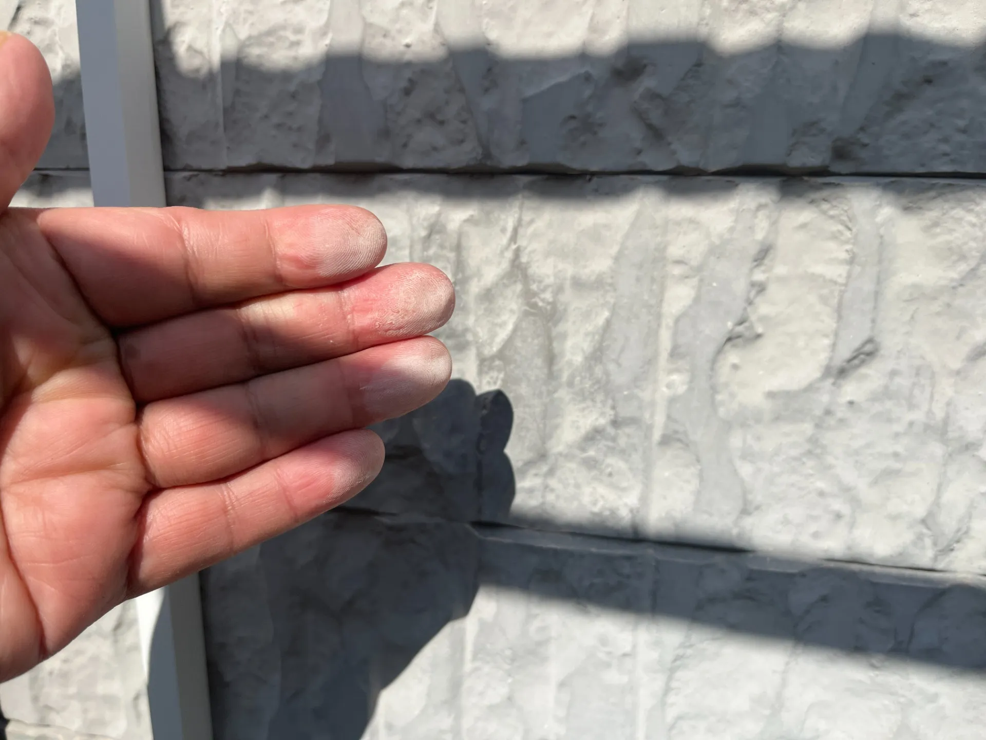 ツヤがなくなりさらに劣化が進むと手に白い粉がつくチョーキング現象が起きます。