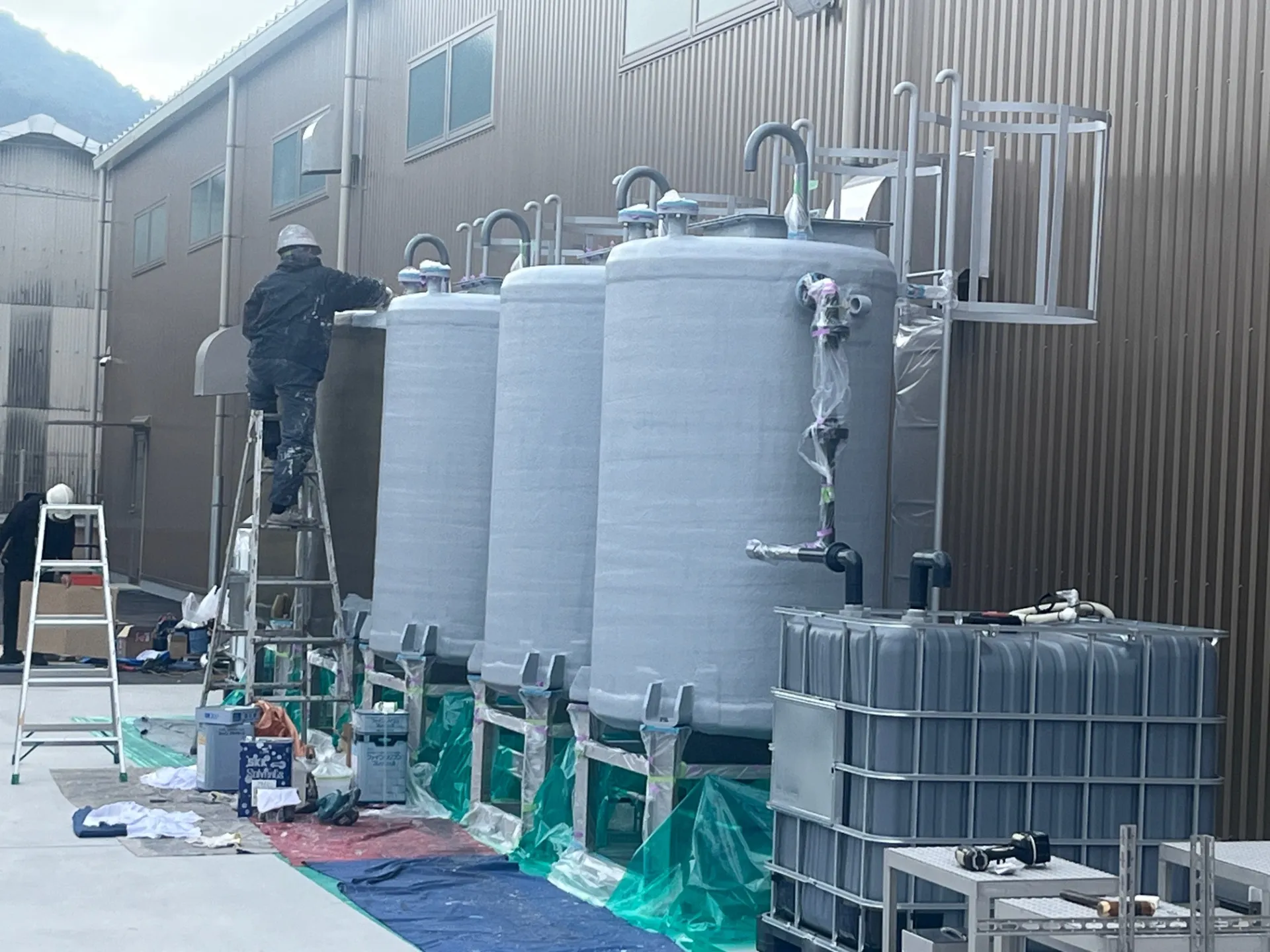 総合紙器様大野工場新築現場本日は、総合紙器様大野工場の現場に入っています。 工場内で使用される、印刷インク分離用のFRP製タンクの塗装工事を担当しています。今日の作業内容今日は、養生作業と下塗…